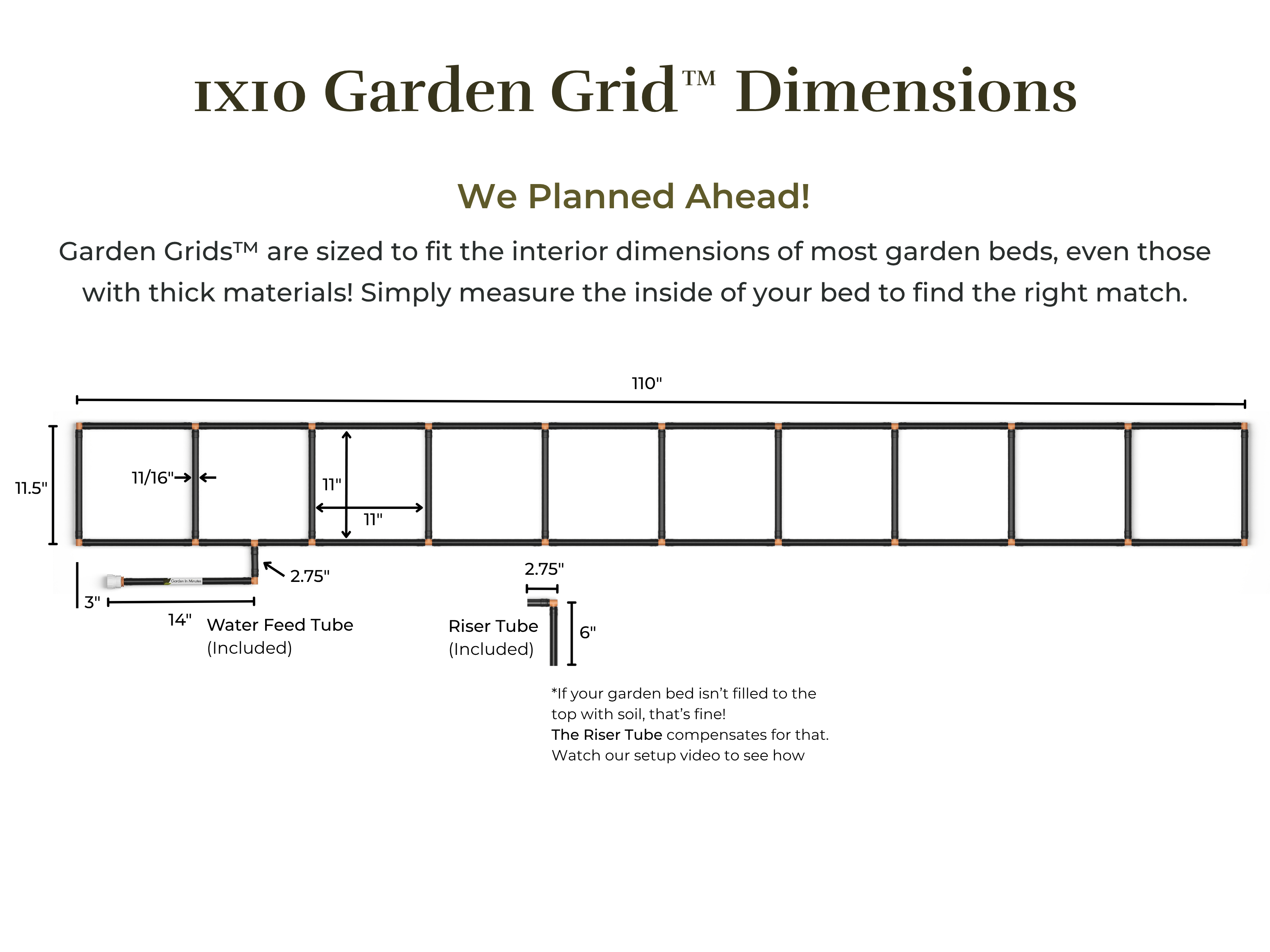 Riser Tubes come with all Garden Grids™ and they’re used inside of your garden bed. You only need to use them when your raised garden soil isn’t filled to the top of your raised garden bed, making your Garden Grid™ sit below the top. of your garden bed too. The riser simply brings your Garden Grid’s™ connection point up to the top of your raised garden bed.