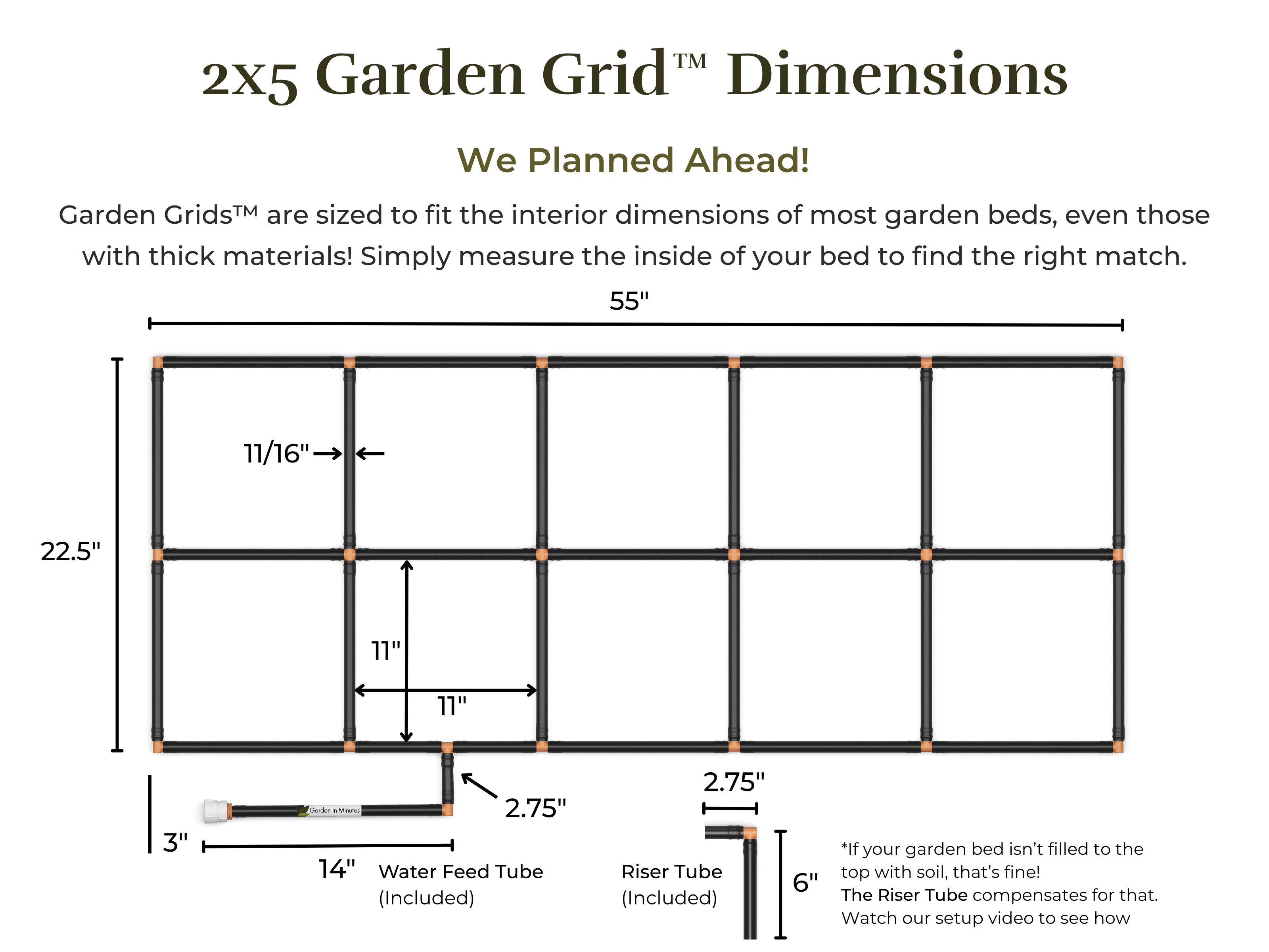 Riser Tubes come with all Garden Grids™ and they’re used inside of your garden bed. You only need to use them when your raised garden soil isn’t filled to the top of your raised garden bed, making your Garden Grid™ sit below the top. of your garden bed too. The riser simply brings your Garden Grid’s™ connection point up to the top of your raised garden bed.