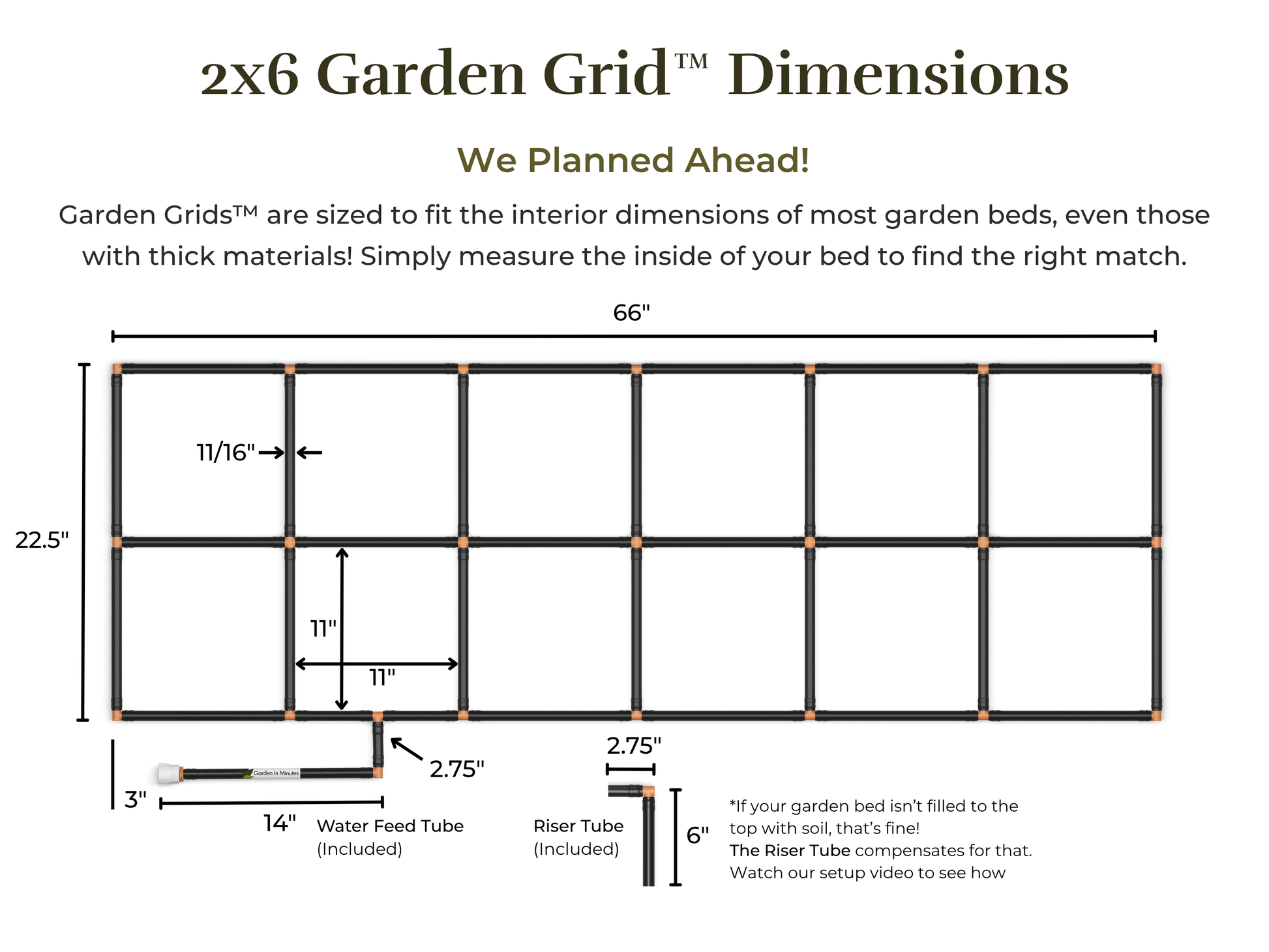 Riser Tubes come with all Garden Grids™ and they’re used inside of your garden bed. You only need to use them when your raised garden soil isn’t filled to the top of your raised garden bed, making your Garden Grid™ sit below the top. of your garden bed too. The riser simply brings your Garden Grid’s™ connection point up to the top of your raised garden bed.