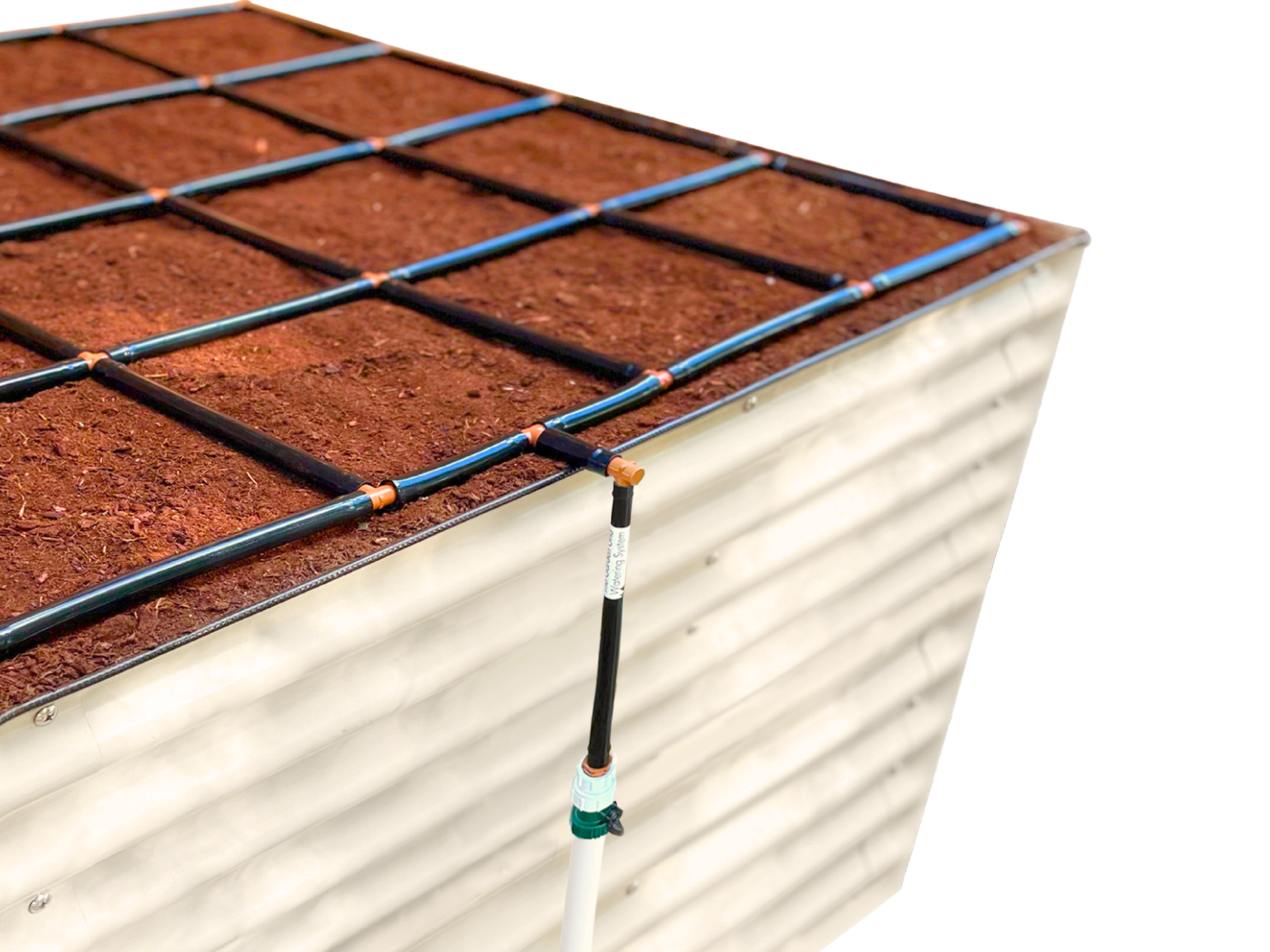 Many raised garden beds focus only on the container and rely on either a built-in reservoir (self-watering) system or a separate drip or soaker setup. Reservoir beds store water at the bottom of the soil, which can lead to oversaturation and increased risk of root stress or rot—while still requiring surface watering for seeds and young plants. Drip and soaker systems, on the other hand, often require running main lines, branching tubing, adding pressure regulators and filters, and rebuilding layouts as you expand.