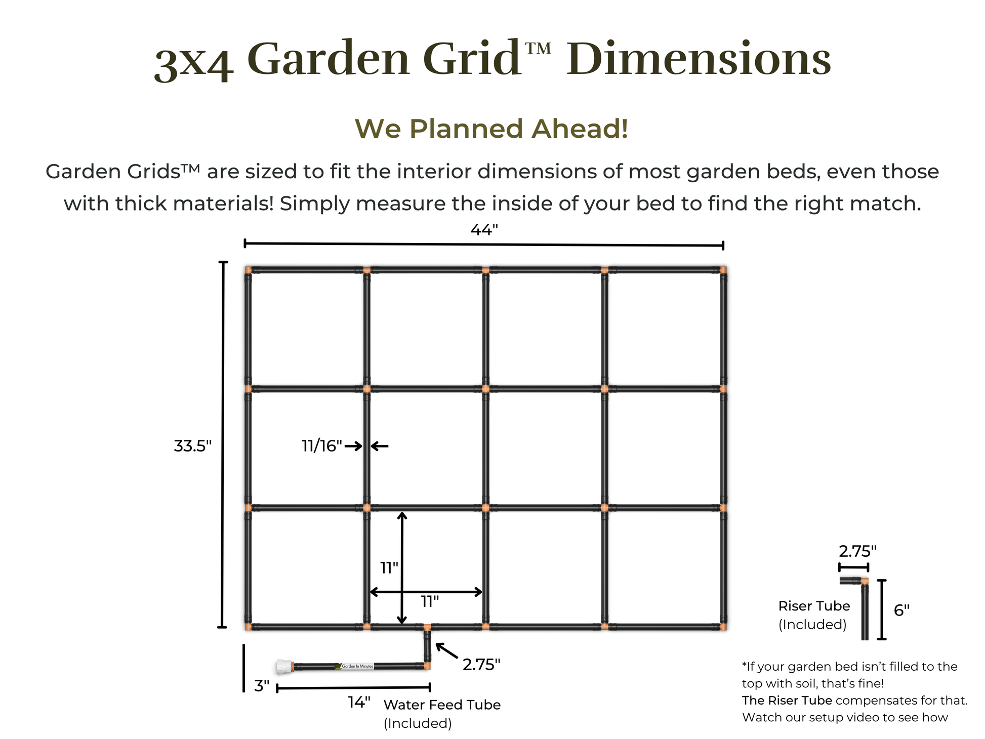• We size Garden Grids™ to fit the interior dimensions of most gardens, accounting for garden bed material thickness. To know which Garden Grid™ will fit your garden bed, reference the overall size of a Garden Grid™ in our product details and in the product title. Example: A 4×4 Garden Grid™ measures ~44″x~44″.