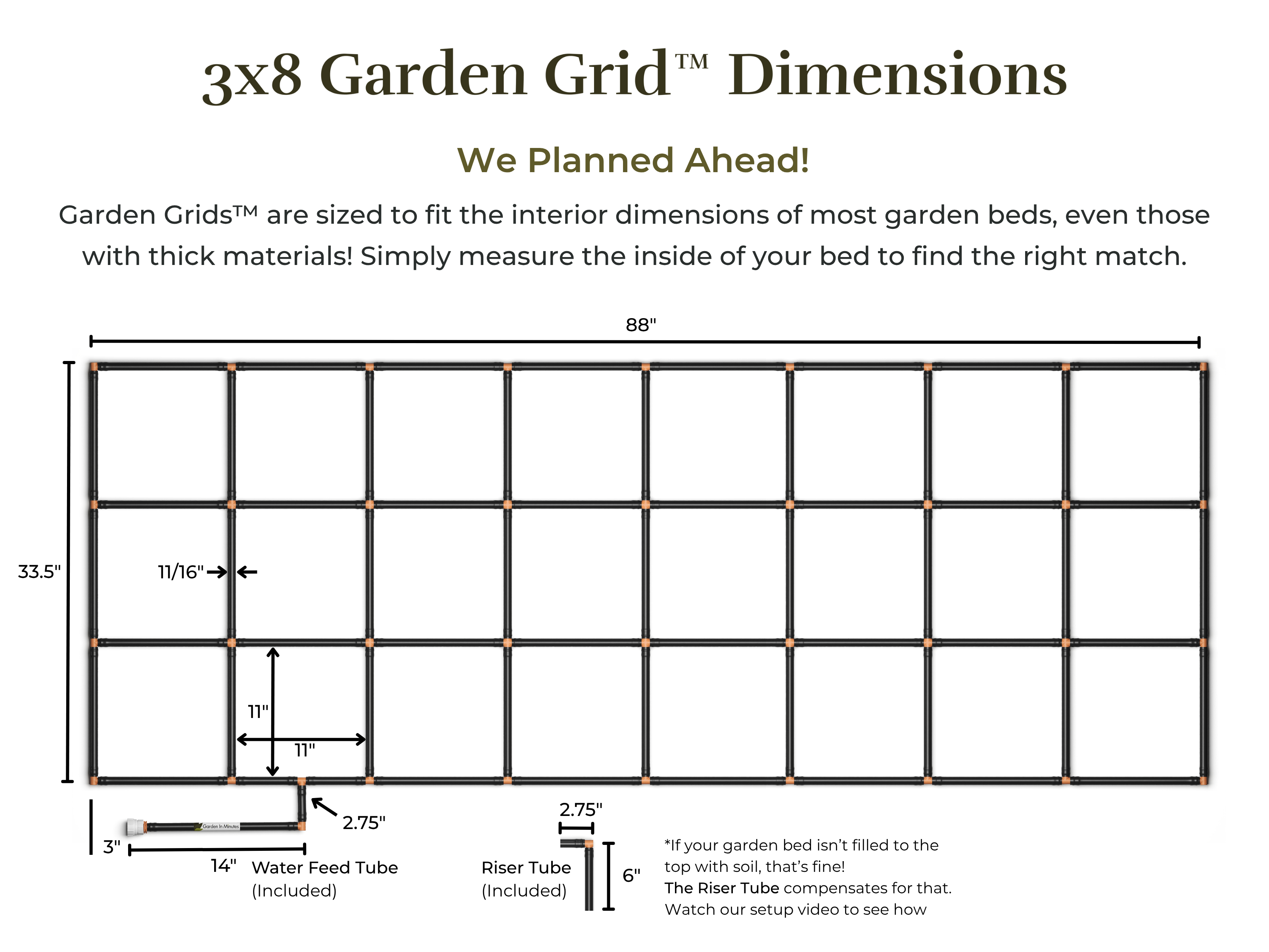 We size Garden Grids™ to fit the interior dimensions of most gardens, accounting for garden bed material thickness. To know which Garden Grid™ will fit your garden bed, reference the overall size of a Garden Grid™ in our product details and in the product title. Example: A 4×4 Garden Grid™ measures ~44″x~44″.