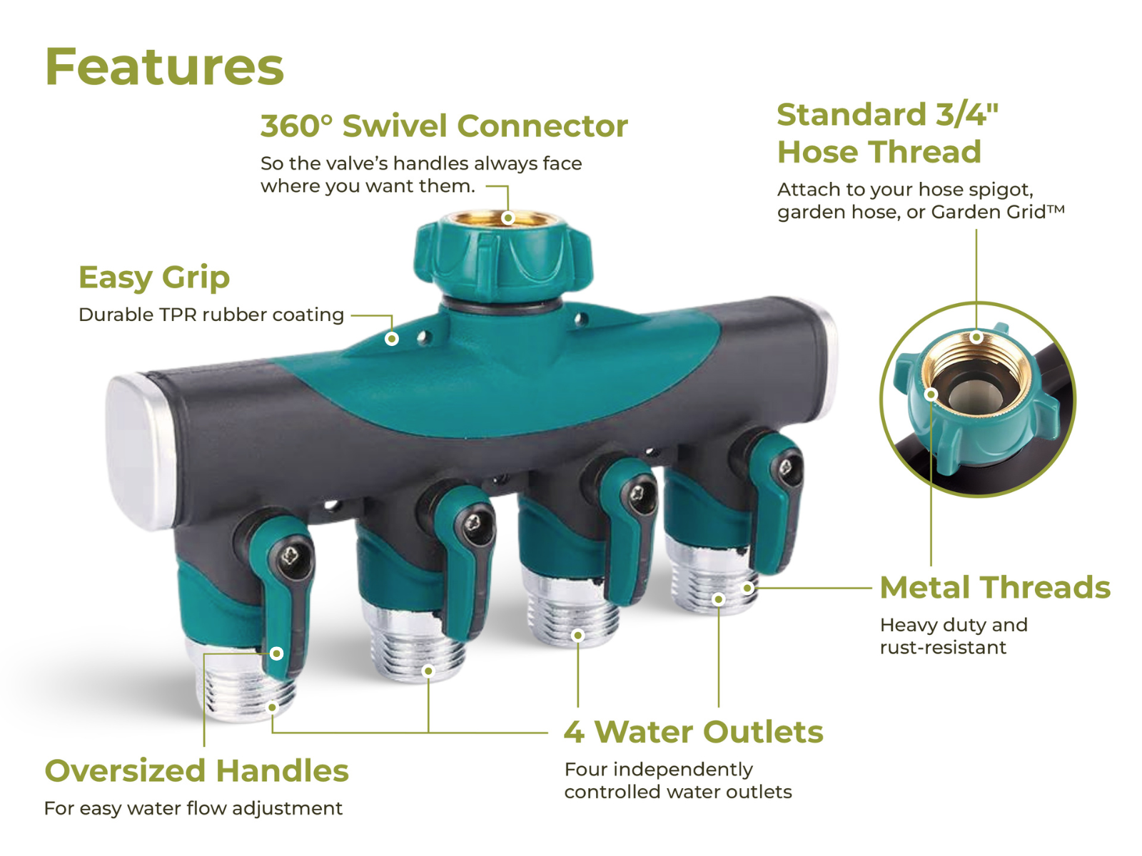 - Standard 3/4" hose thread. Attach to your hose spigot, garden hose, or Garden Grid™.