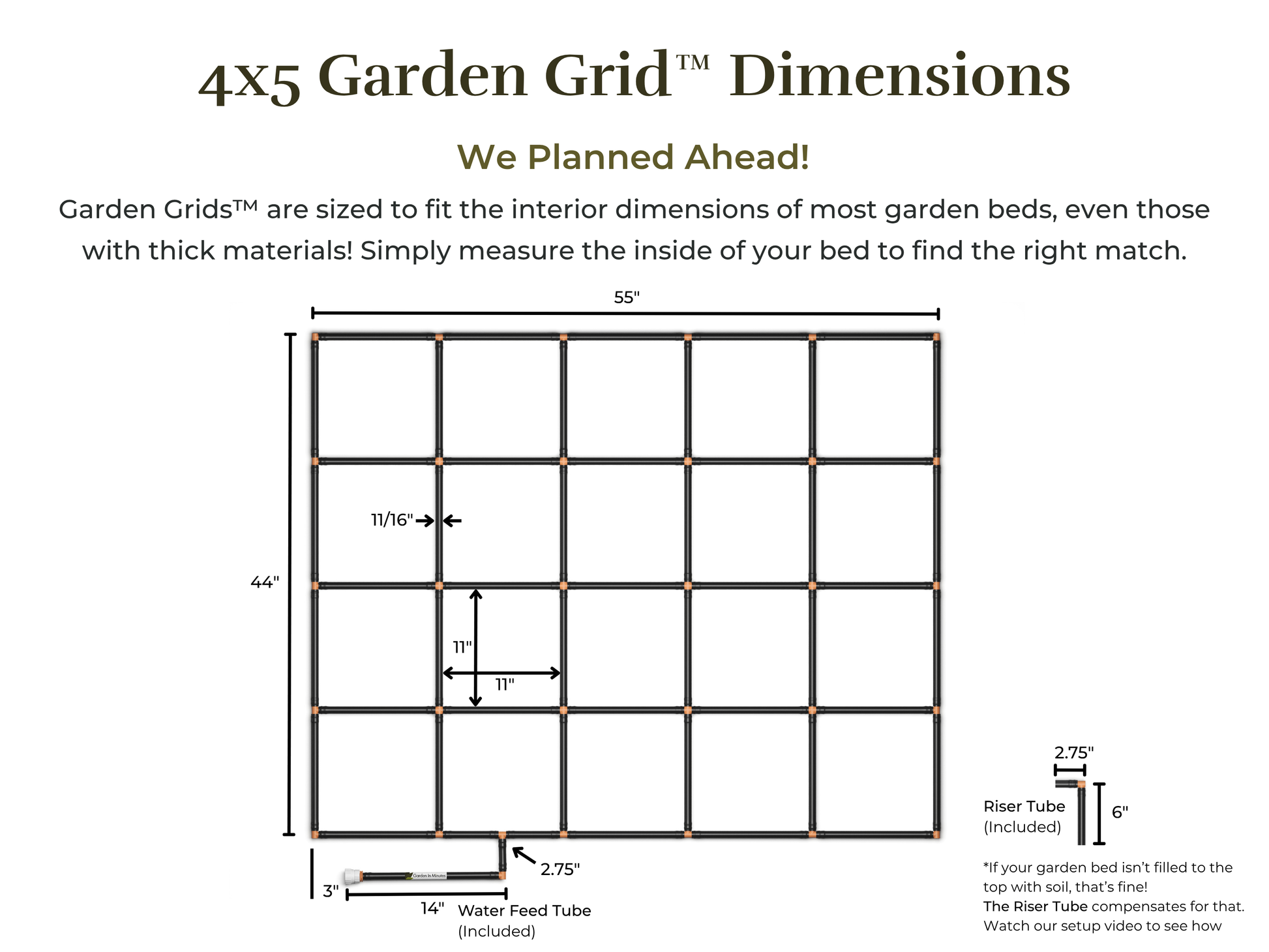 • We size Garden Grids™ to fit the interior dimensions of most gardens, accounting for garden bed material thickness. To know which Garden Grid™ will fit your garden bed, reference the overall size of a Garden Grid™ in our product details and in the product title. Example: A 4×4 Garden Grid™ measures ~44″x~44″.
