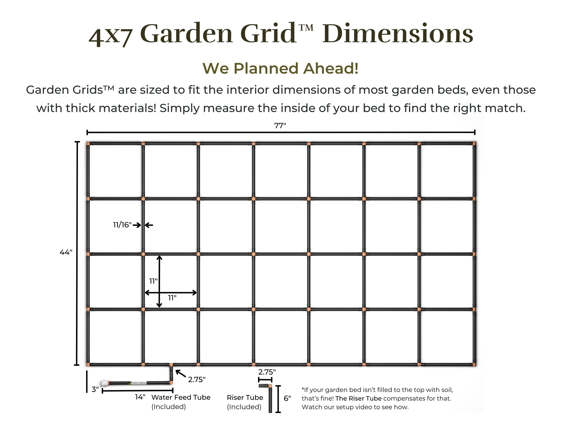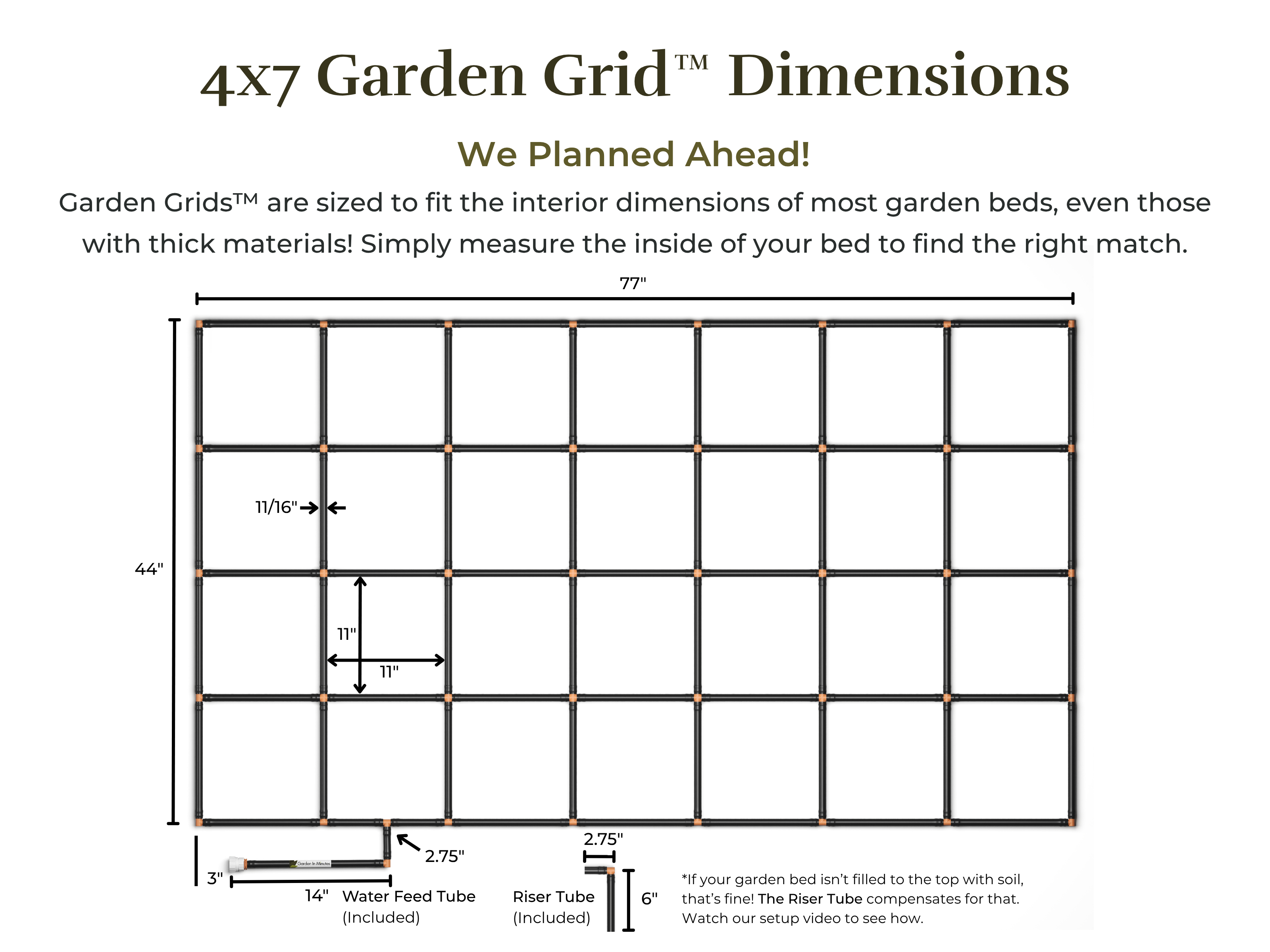• We size Garden Grids™ to fit the interior dimensions of most gardens, accounting for garden bed material thickness. To know which Garden Grid™ will fit your garden bed, reference the overall size of a Garden Grid™ in our product details and in the product title. Example: A 4×4 Garden Grid™ measures ~44″x~44″.