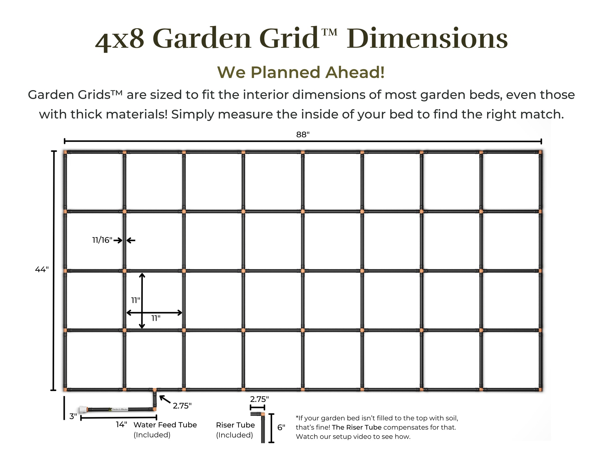 • We size Garden Grids™ to fit the interior dimensions of most gardens, accounting for garden bed material thickness. To know which Garden Grid™ will fit your garden bed, reference the overall size of a Garden Grid™ in our product details and in the product title. Example: A 4×4 Garden Grid™ measures ~44″x~44″.