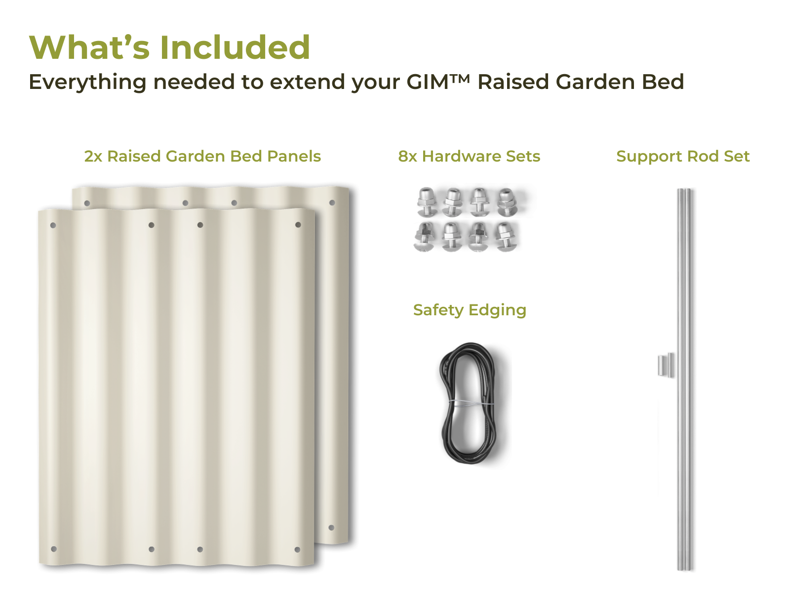 These expansion kits are designed for 17" tall GIM™ Metal Raised Garden Beds that are 2ft or 4ft wide.